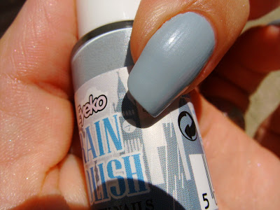 Enfim, seja como for este azul chumbo é simplesmente fenomenal! Tem alturas que a malta até jurava que era cinzento, mas depois ganha cambiantes azuladas tal qual um céu plúmbeo (obrigada Alexandre Herculano por teres existido e por eu ter que te ter gramado na escola, senão agora não teria feito este brilharete!), principalmente quando esse céu plúmbeia (humm... esta agora é que já não tenho tanta certeza...) em Inglaterra! Com este toluenozinho nas unha senti-me um autêntico gentleman, o que não deixa de ser chato para os gentlemen porque então é sinal que eu, no meu subconsciente, os imagino de unhas pintadas e tal, a agarrar no chapéuzinho-de-chuva e no chapéuzinho de côco, uh-lá-lá... Bom, mas divago! A verdade é que este Rain também é altamente pigmentado. Duas camadas é tudo quanto foi necessário para essas fotografias. À primeira camada a malta pensa: Pronto! Fui roubada! 4 euros para esta aguadilha nojenta! - Mas depois tudo se compõe e já não estamos a desejar que todos os funcionários da Eyeko fiquem instantâneamente carecas e com hálito de rabo mal lavado pelo resto dos seus dias! Ufa, hein Funcionáriozinhos da Eyeko?? Safaram-se de boa!